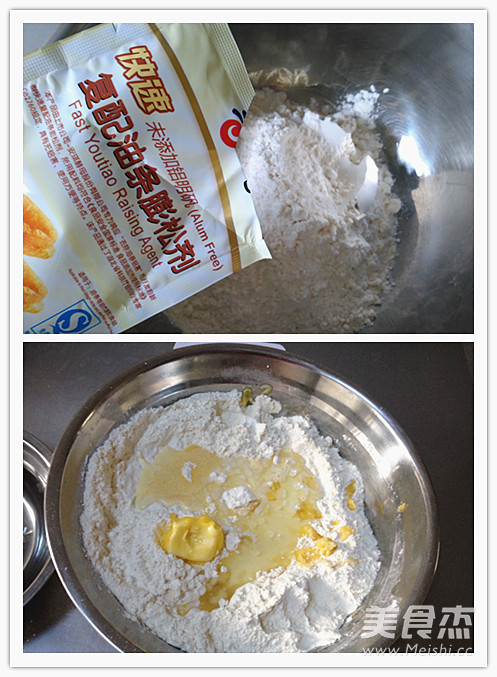 - Đổ bột mỳ vào bát, cho muối, đường, bột soda, bột làm quẩy vào trộn đều.