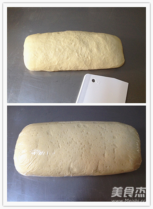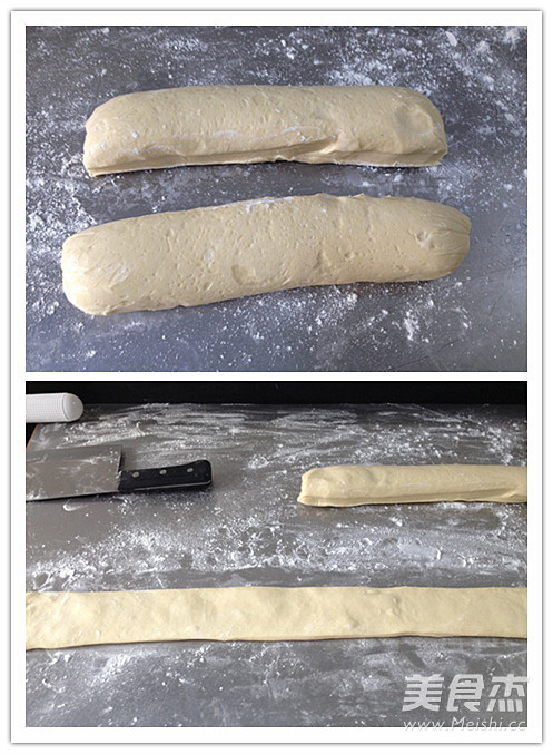 - Sau khi bóc lớp túi ra khỏi khuôn bột, rắc lên bề mặt một ít bột mỳ, cắt đôi phần bột rồi chia dần. Sau đó kéo dài như hình.