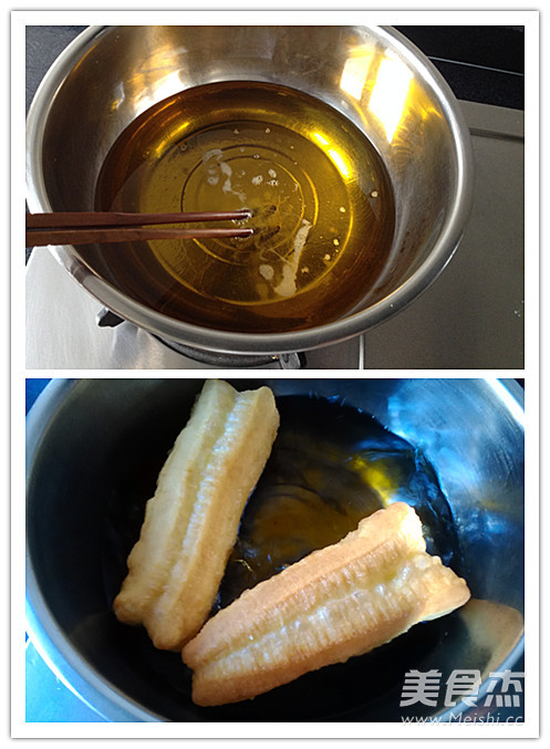 - Tiếp đó lấy chảo và đổ ngập dầu, để lửa ở nhiệt độ trung bình đến khi dầu sôi. Sau khi kéo dài miếng bột rồi thả nhẹ nhàng vào chảo, bắt đầu giảm lửa, đến khi miếng quẩy bắt đầu phồng lên thì dùng đũa lật lại đến khi hai mặt vàng đều là được.