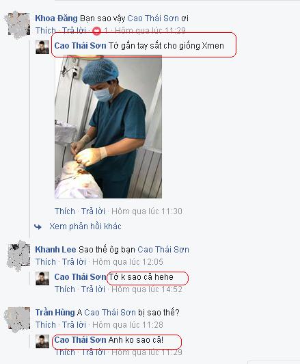 Đáp lời người hâm mộ, ca sĩ Cao Thái Sơn chia sẻ anh thực hiện một ca mổ nhẹ ở cánh tay nhưng vết thương không mấy nghiêm trọng. "Không sao nhé. Tớ gắn tay sắt cho giống Xmen" - giọng ca "Con đường mưa" hài hước trả lời fan.