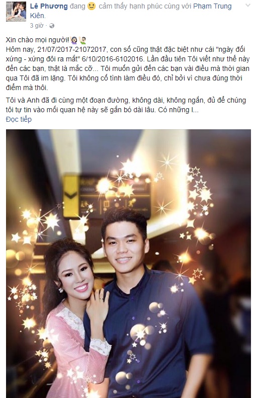 Đồng thời cũng qua status đó, Lê Phương muốn gửi lời cảm ơn đến những người đã dõi theo, ủng hộ cô cũng như cuộc tình với Trung Kiên trong suốt thời gian vừa rồi.