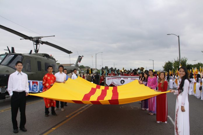 Các em học sinh trường trung học Westminster tham gia diễn hành Tết (Hình: Ngọc Lan/Người Việt)