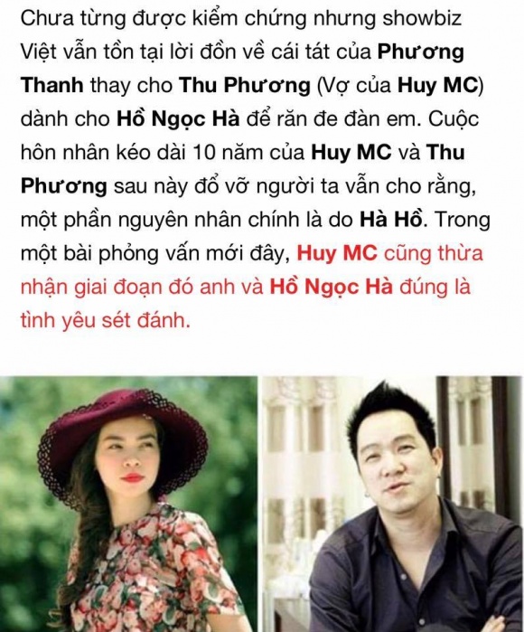 Được biết, Hồ Ngọc Hà bị coi là kẻ thứ 3 chen chân vào gia đình Thu Phương và Huy MC, khiến gia đình 4 người bị tan vỡ. Thu Phương không trực tiếp đứng ra đánh ghen, thay vào đó là người bạn thân Phương Thanh thay mặt Thu Phương "tát" cho Hồ Ngọc Hà một bạt tai để cảnh cáo, nhưng đã tạo nên một trong những scandal chấn động showbiz Việt cách đây hơn chục năm.