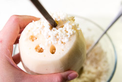 Để nhồi gạo vào trong ngó sen, đặt một thìa gạo đầy lên trên mặt cắt, rồi dùng đũa đẩy và nén gạo thật chặt vào trong từng lỗ, kể cả những lỗ nhỏ.