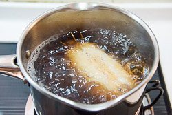 Khi nước sôi và đường tan hết, giảm xuống lửa vừa, đậy nắp và tiếp tục đun trong 1 giờ. Lật ngó sen sau mỗi 30 phút và thêm nước nếu cần thiết. Giảm lửa xuống mức nhỏ nhất và để sôi lăn tăn thêm 20 phút nữa. Lật ngó sen 4-5 lần trong khi nấu.