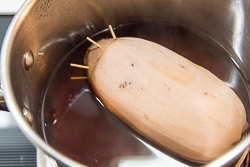 Đậy phần “nắp” được cắt ra lúc trước vào đúng vị trí cũ, khi nấu lên, gạo bên trong ngó sen sẽ nở ra và lấp vào các lỗ ở phần “nắp” Dùng 6-8 cái tăm để ghim cố định hai phần này với nhau. Chú ý xỏ tăm vào càng sâu càng tốt vì khi nấu, gạo nở bung có thể khiến phần “nắp” rời ra nếu tăm giữ không đủ chặt.