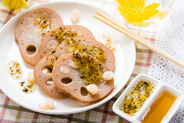 Rưới siro quế hoa hoặc mật ong lên trên các lát ngó sen. Món ăn này có thể dùng ấm hoặc lạnh đều vẫn giữ được hương vị thơm ngon.