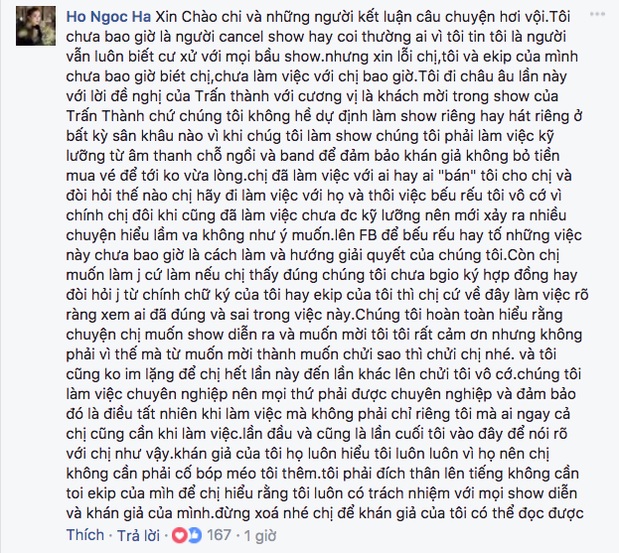 Nữ ca sĩ Cả một trời thương nhớ nhấn mạnh: “Tôi và ê-kíp chưa bao giờ biết chị, chưa làm việc với chị bao giờ”. Theo Hồ Ngọc Hà, cô nhận show châu Âu qua lời mời của Trấn Thành. Cô đảm nhận vai trò ca sĩ khách mời tại show của anh và không hề có ý tổ chức show của riêng mình theo cách qua loa như thế.