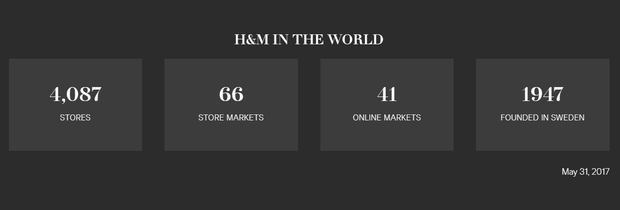 Tính đến tháng 5/2017, H&M đã có tổng cộng 4.087 cửa hàng trải dài trên 66 quốc gia.