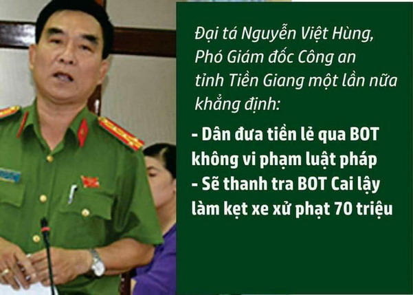 Phát biểu của công an Tiền Giang làm nức lòng tài xế và nhân dân (riêng vụ "thanh tra BOT Cai Lậy" là do dân mạng chế thêm vì quá hứng). Dù nhà đầu tư lập danh sách 19 xe "trả tiền lẻ" rồi đưa công an nhưng thực tế công an không xử, vì đại tá Hùng nói quá rõ.