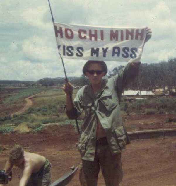 Một người lính Mỹ cầm tấm pano trên tay với dòng chữ "HO CHI MINH KISS MY ASS"