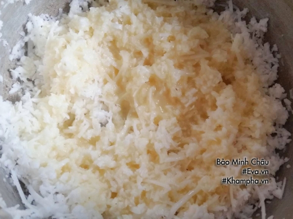 - Dừa nạo đun sôi, để ráo nước. Ướp dừa với sữa đặc, tùy theo khẩu vị của mỗi người mà cho ngọt ít hay nhiều.