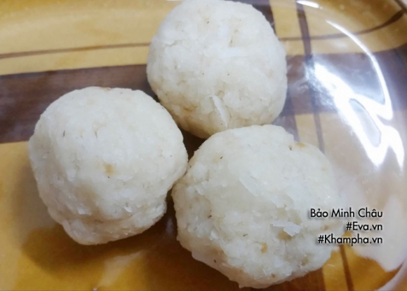 - Ướp khoảng vài tiếng rồi cho lên bếp sên nhỏ lửa. Khi thấy dừa trong, dính đũa thì cho nước bột nếp đã hòa vào. Tiếp tục đảo đều tay, đến khi nhân dừa dẻo, thơm là được. Dùng bao tay nắm nhân dừa thành các nắm nhỏ bằng nhau theo tỉ lệ 2 nhân 1 vỏ.