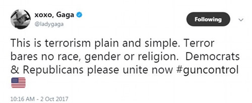 Trong số đó, Lady Gaga và Julianne Moore là hai ngôi sao có phản ứng mạnh mẽ nhất sau sự kiện kinh hoàng. Giọng ca Bad Romance kêu gọi nhà chức trách nhanh chóng thắt chặt luật kiểm soát súng và không ngần ngại nhắc tên ông Donald Trump cùng phát ngôn viên Nhà Trắng vào dòng tweet của mình. Cô viết thêm rằng: "Máu đang vương trên tay của những người có quyền lập pháp", đồng thời khẳng định: "Khủng bố không phân biệt chủng tộc, giới tính hay tôn giáo". Vào năm 2016, Lady Gaga cùng 180 người nổi tiếng khác đã ký vào thư ngỏ gửi cho Quốc hội Mỹ nhằm phản đối việc cấp phép sử dụng vũ khí bừa bãi.