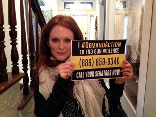 Nữ diễn viên Julianne Moore thì đặt câu hỏi: "Quốc hội sẽ xử lý việc này ra sao?", không quên kèm dòng hashtag #endgunviolence (chấm dứt bạo lực súng đạn). Những năm gần đây, ngôi sao Still Alice vẫn tích cực tham gia vào các hoạt động xã hội và là một trong những người sáng lập tổ chức Every Town for Gun Safety.