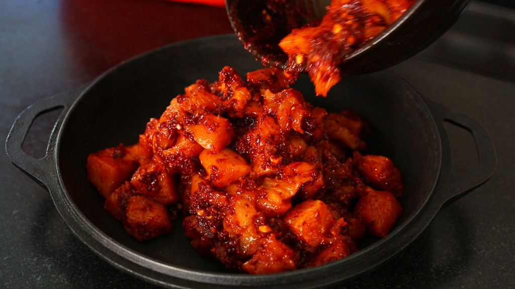 Buldak hay gà phô mai là món ăn nổi tiếng của Hàn Quốc, trong đó thịt gà được tẩm ướp đậm đà, với gia vị chính là ớt. Buldak thường được ăn cùng các món nhạt như trứng hấp hay cơm để giảm bớt vị cay. Ảnh: Maangchi.