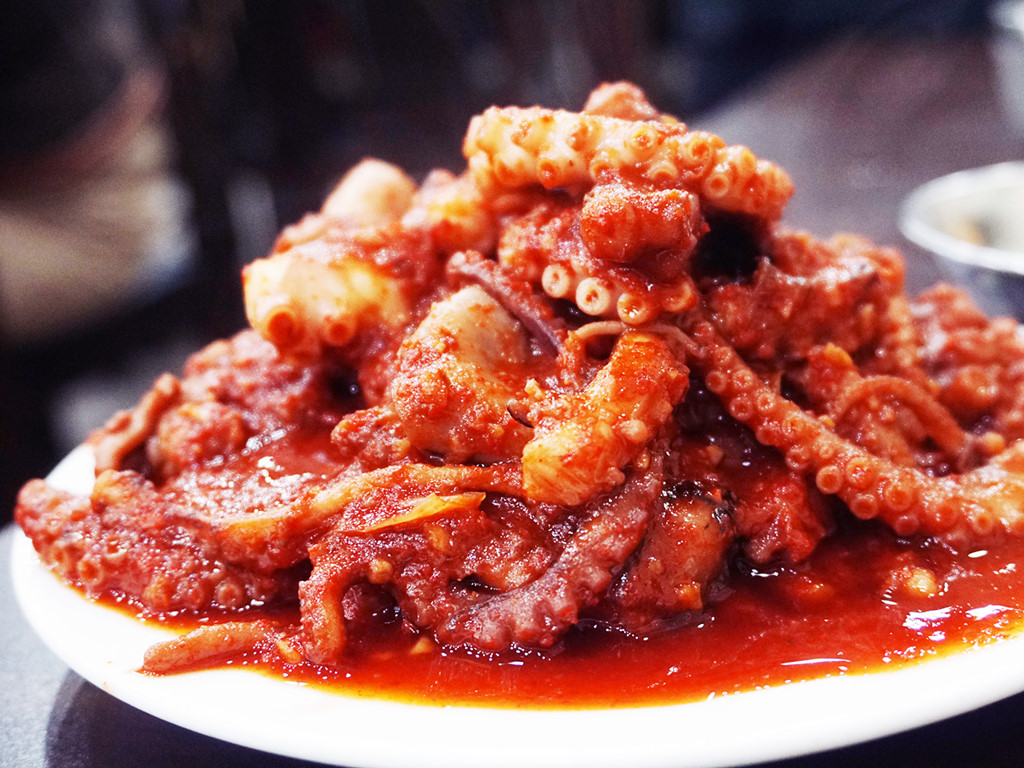 Chỉ mới nhìn thoáng qua, món nakji bokkeum hay bạch tuộc xào đã khiến nhiều thực khách phải e dè. Bạch tuộc được xắt nhỏ, xào cùng các loại rau củ như hành, cà rốt, bắp cải, sau đó cho thêm sốt ớt đỏ gochujang, xì dầu, tỏi, muối và đường. Ảnh: Timeout.