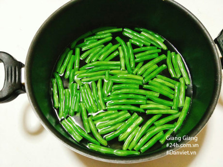 - Bước 2: Cho nước vào nồi đun sôi rồi thêm 1 thìa cà phê muối sau đó cho đậu vào chần sơ qua, mẹo nhỏ để món đậu đũa xào thịt băm có màu xanh mát mắt mà không bị chuyển màu vàng thì bạn nên chần đậu trước khi xào nhé. Thời gian chần đậu khoảng 1 phút là vớt ra ngay.