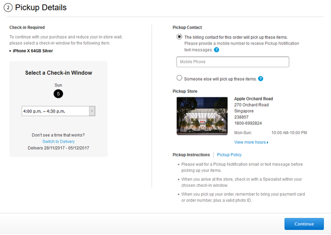 Đây là giao diện đặt hàng online của tôi nhận order tối 4/11 cho một chiếc Apple iPhone X 64GB, về điểm giao máy tại Apple Store ở Singapore.