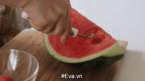 Dưa hấu bổ làm 4, sau đó dùng muỗng múc hoa quả chuyên dụng, múc dưa hấu ra bát. Các viên dưa hấu sẽ có hình tròn đẹp mắt. Với cách bổ dưa kiểu này, bạn có thể ăn trực tiếp, trang trí món ăn, nấu chè hoặc làm hoa quả dầm đều đẹp.