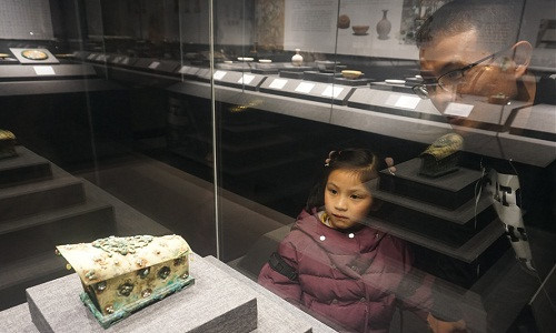 Khách tham quan chiêm ngưỡng cổ vật thời nhà Đường được trưng bày trong tủ kính.