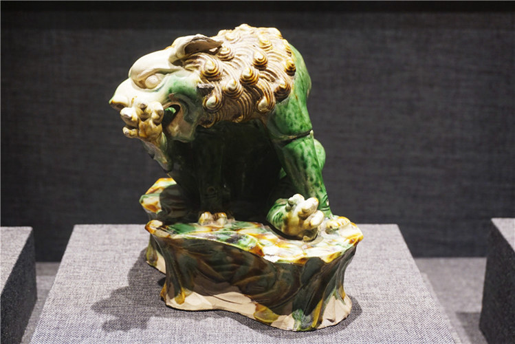 Cổ vật gốm ba màu khắc họa hình ảnh con sư tử còn khá vẹn nguyên.