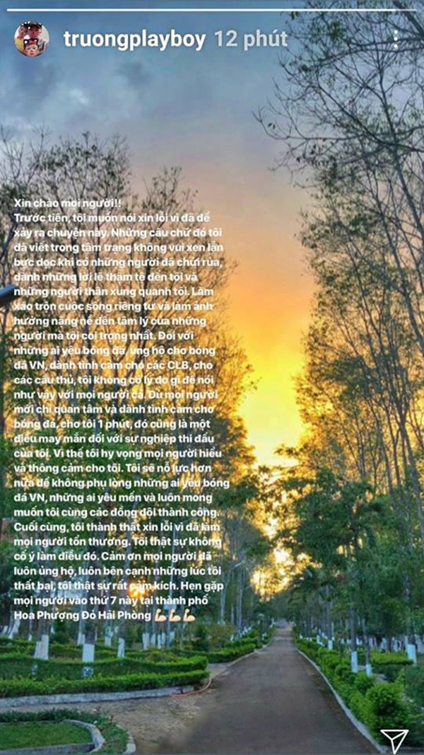 Ngay sau đó, Xuân Trường có bức "tâm thư" đăng tải xin lỗi người hâm mộ. "Trước tiên tôi muốn nói xin lỗi vì đã để xảy ra chuyện này. Những câu chữ đó tôi đã viết trong tâm trạng không vui xen lẫn bực dọc khi có những người đã chửi rủa, dành những lời lẽ thậm tệ đến tôi và những người thân xung quanh tôi. Làm xáo trộn cuộc sống riêng tư và làm ảnh hưởng nặng nề đến tâm lý của những người mà tôi coi trọng nhất", nam cầu thủ giải thích.