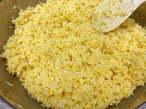 Giã cho hạt cơm giòn hơi vụn rồi trộn vào chỗ cơm đã trộn trứng ở trên.