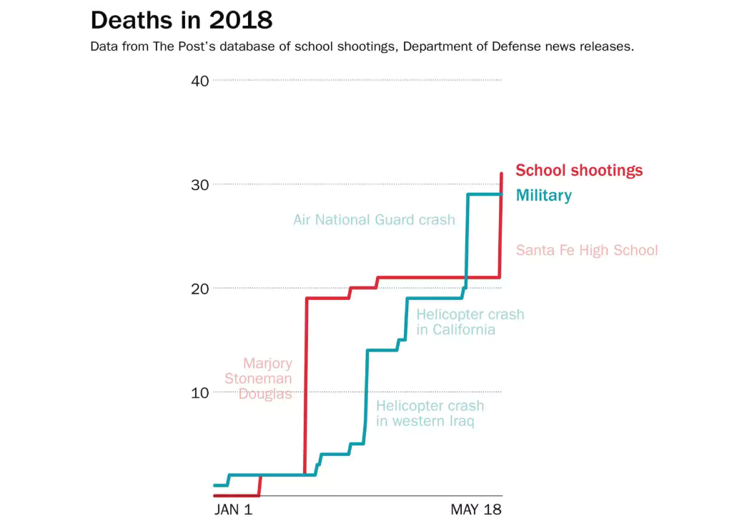 Trong những năm trở lại đây có thể thấy rõ hầu hết các vụ xả súng ở Mỹ đều xảy ra chủ yếu ở các trường học. Qua đó mới thấy thế hệ trẻ của Mỹ đang ngày càng bị ảnh hưởng tư tưởng bạo lực cộng với lối sống không lành mạnh dễ dẫn tới các hành vi cực đoan. Xem ra việc đi lính có lẽ còn an toàn hơn là việc đi học. Kết quả thống kê mới đã tiết lộ một sự thật đáng báo động, tính từ đầu năm đến nay số trẻ thiệt mạng vì bạo lực liên quan đến súng ống ở Mỹ đã vượt qua tổng số ca tử trận của lính Mỹ trên chiến trường. Dựa trên số liệu thu thập từ các thông cáo của Bộ Quốc phòng Mỹ, tờ Washington Post hôm 20.5 công bố báo cáo cho thấy số học sinh/sinh viên (không tính giáo viên, nhân viên) thiệt mạng trong các vụ xả súng ở khuôn viên trường học cao hơn hẳn số ca tử vong ở quân nhân từ đầu năm đến nay.
