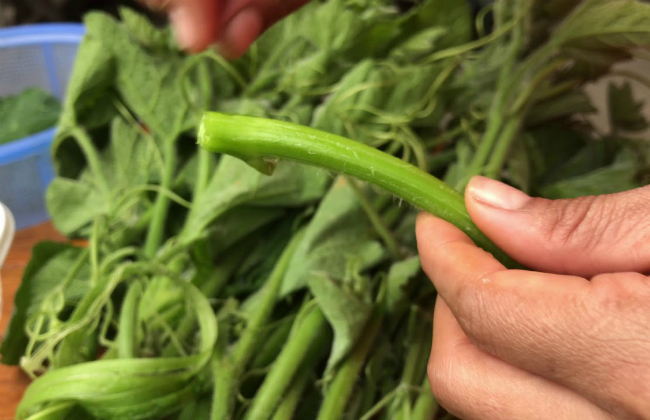 Khi rửa cũng rửa riêng phần cành và cuống lá, vì cuống sạch hơn lá nên không cần rửa quá kỹ. Rửa xong vẩy nước thật khô và vò lá trước khi nấu.