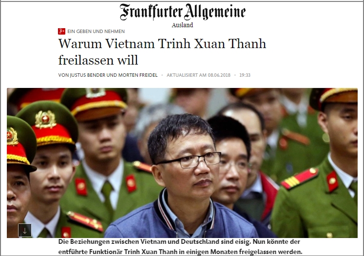 Trên tờ Frankfurter Allgemeine, một nhật báo tầm vóc liên bang và có uy tín nhất nhì nước Đức, số ra ngày thứ bảy 09/06/2018, có đăng một bài báo với tựa đề „Cho và nhận“ và ngay sau đó là hàng tít phụ „Tại sao Việt Nam muốn thả Trịnh Xuân Thanh trong một vài tháng tới“. Bài báo này đã được nhiều báo chí Đức đồng loạt trích đăng, đặc biệt hãng thông tấn Anh cũng đưa tin dựa vào nội dung bài báo trên. Sau đây là bản dịch bài báo của nhật báo Đức Franfurter Allgemeine: