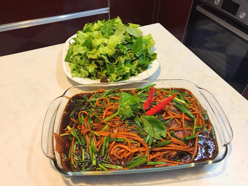 - Rau củ gồm: Cà rốt thái sợi, hành, thì là thái khúc dài, hành tây bổ sợi, có thêm ít nấm hương thái lát cũng góp phần tạo thêm hương vị món ăn.