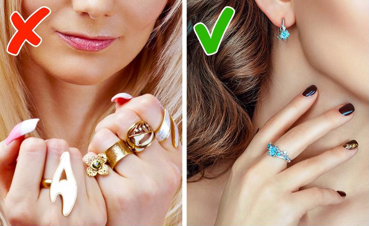 Đừng nghĩ đeo nhiều trang sức giá trị sẽ khiến bạn sở hữu ngay vẻ ngoài sang trọng và đẹp mắt. Đây chính là nguyên nhân khiến hình ảnh bên ngoài trong hơi "quá" và lòe loẹt. Bên cạnh đó, đeo nhiều món trang sức màu vàng chói sẽ tạo ấn tượng không tốt đối với người đối diện.