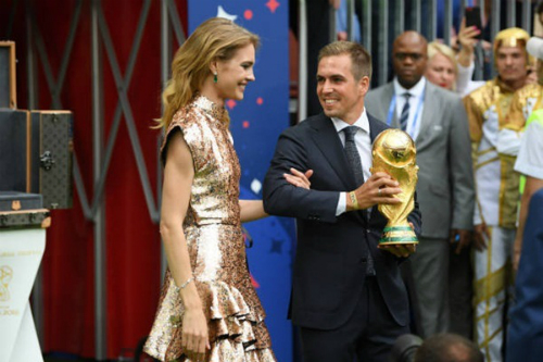 Siêu mẫu Nga Natalia Vodianova (trái) tiến ra sân khấu cùng cựu đội trưởng tuyển Đức vô địch World Cup 2014 - Philipp Lahm. Hai người mang theo chiếc cúp vàng của giải đấu năm nay.