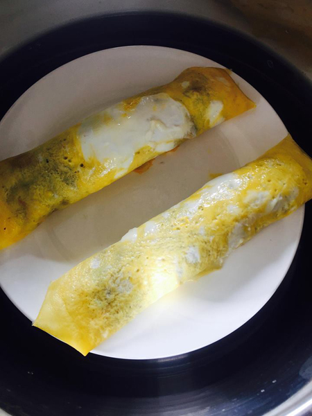 - Trứng cho vào bát với ít muối đánh tan. Làm nóng chảo cho ít dầu vào, cho trứng vào chiên mỏng, trứng chín lấy ra đĩa, cho tôm vào quét đều lên trứng. Sau đó cuộn tròn lại hấp 20-30 phút cho tôm chín.