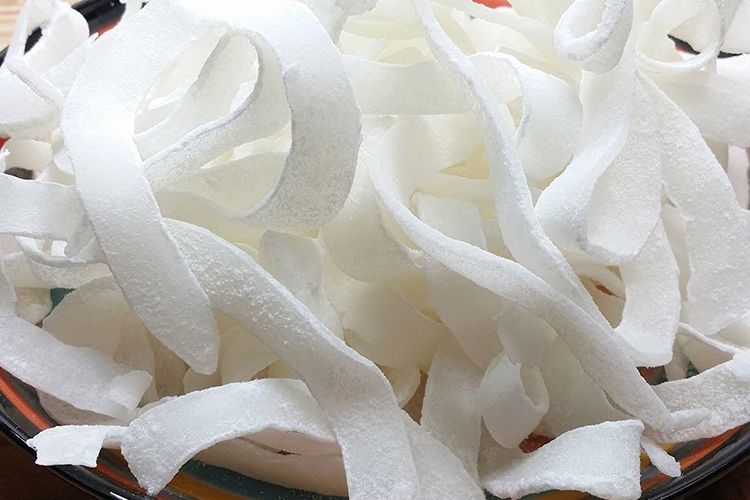 Dùng dụng cụ nạo chuyên dụng nạo cùi dừa thành các lát mỏng và dài. Nạo ngang vòng tròn xung quanh với độ dài và độ mỏng trung bình.