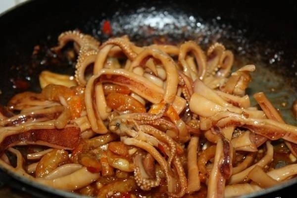 Bước 5. Để lửa liu riu, cho mực vào đảo qua đảo lại để gia vị ngấm đều vào mực . Đợi khoảng 5 -10 phút khi thấy nước mực keo sệt lại, chuyển qua màu đỏ thì tắt bếp.