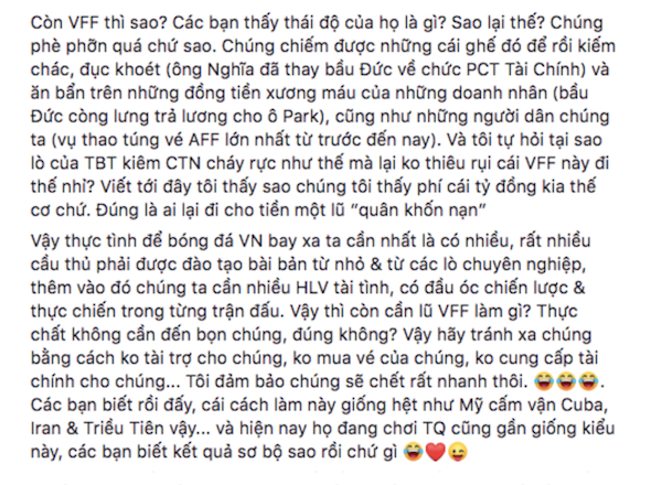 “Còn VFF thì sao? Các bạn thấy thái độ của họ là gì? Sao lại thế? Chúng phè phỡn quá chứ sao. Chúng chiếm được những cái ghế đó để rồi kiếm chác, đục khoét (ông Nghĩa đã thay bầu Đức về chức PCT Tài Chính) và ăn bẩn trên những đồng tiền xương máu của những doanh nhân (bầu Đức còng lưng trả lương cho ô Park), cũng như những người dân chúng ta (vụ thao túng vé AFF lớn nhất từ trước đến nay). Và tôi tự hỏi tại sao lò của TBT kiêm CTN cháy rực như thế mà lại ko thiêu rụi cái VFF này đi thế nhỉ? Viết tới đây tôi thấy sao chúng tôi thấy phí cái tỷ đồng kia thế cơ chứ. Đúng là ai lại đi cho tiền một lũ “quân khốn nạn””.