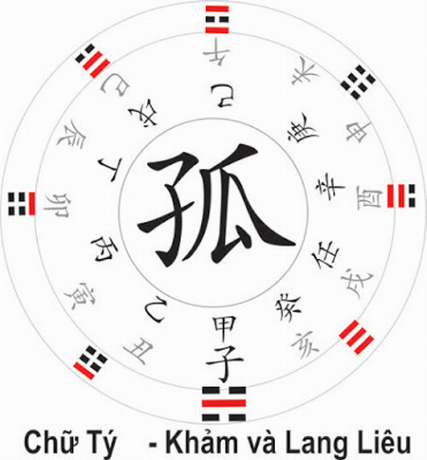 Chữ 孤 gồm Tử 子 và chữ Qua瓜, về dịch lý thì Tử子- con trai – Lạc Thư – Dương, Qua瓜 trái dưa – Hà Đồ – Âm. Dương Âm tức Càn Khôn hay bản thể của vũ trụ. Còn theo câu chuyện thì chữ Tử子chính là chi Tý, Chữ Qua 瓜 – trái dưa – tròn, tượng trưng cho bản thể hay Hà Đồ vì nó tròn, như hình minh họa ở trên. Chữ 子Tý, chi đầu tiên trong 12 chi, nằm ở cung Khảm. Nhìn vào hình minh họa ta thấy Tý – Khảm tượng trưng cho Lang Liêu, một hào dương cô độc. Vì giờ Tý nằm giữa âm dương hay AM và PM, tức 12 giờ khuya nên truyện viết “ngày đêm lo lắng”.