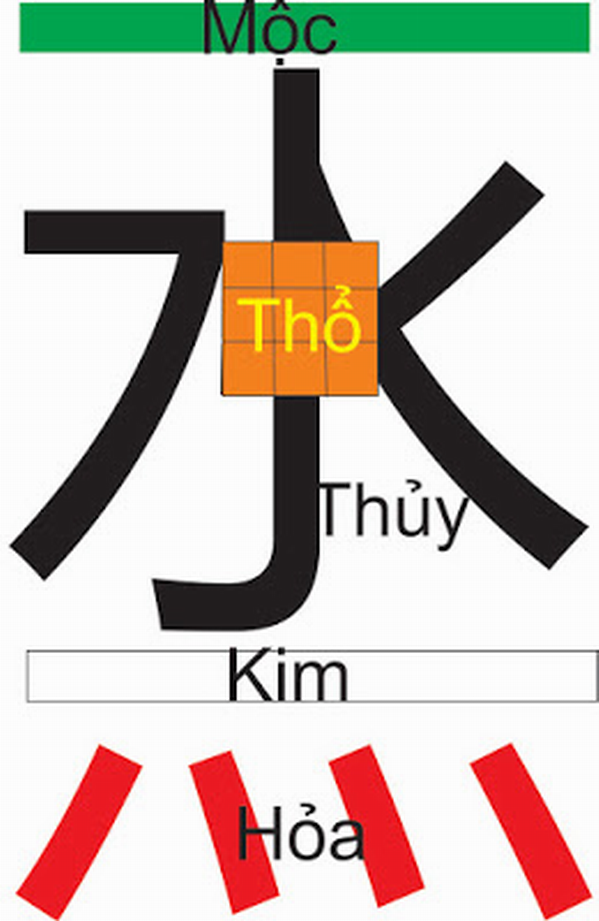 Dưới bộ HỎA灬 Lửa, Nhất一 Đáy nồi – KIM金, Thủy – THỦY水, Bộ Thảo艹hay chữ Nhất一 – Nắp đậy – MỘC木, Bánh chưng ở giữa nước -THỔ土. Tất cả nói lên khái niệm ngũ hành.