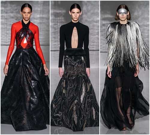 Show diễn của Givenchy bắt đầu với áo khoác đen nhấn vào eo và vạt chéo trắng lệch một bên cùng quần legging da bóng.