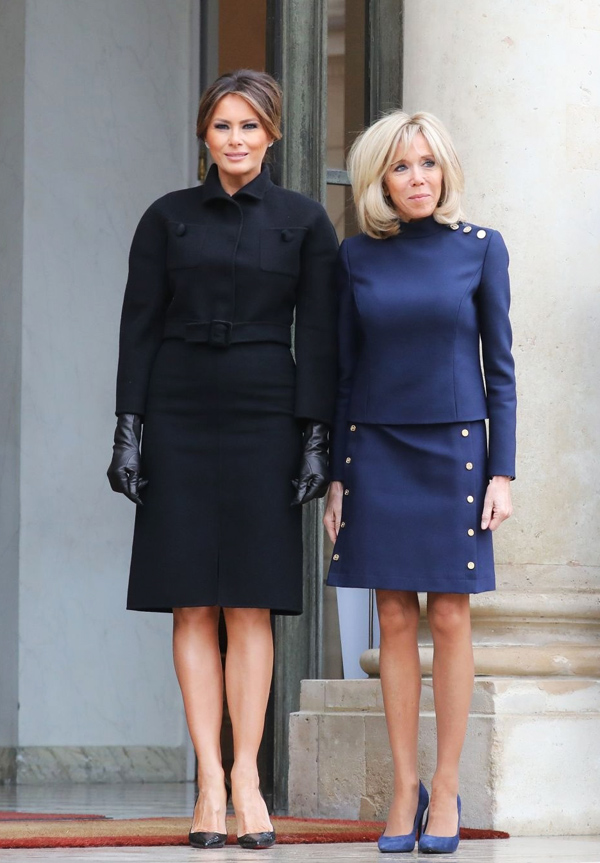 Sánh vai phu nhân Tổng thống Pháp Brigitte Macron tại Cung điện Elysee (Paris), bà Trump dù không diện váy ôm khít phần dưới nhưng vẫn để lộ bụng to.