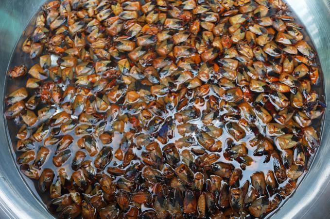 Người dân cho bọ xít vào chậu nhôm để ướp gia vị trong quá trình chế biến.