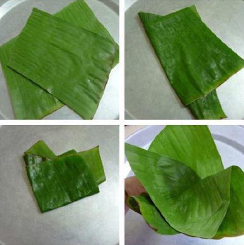 - Xếp 2 lớp lá chuối, lớp ngoài để phần mặt xanh của lá xuống dưới, lớp bên trong để phần mặt xanh của lá chuối lên trên.
