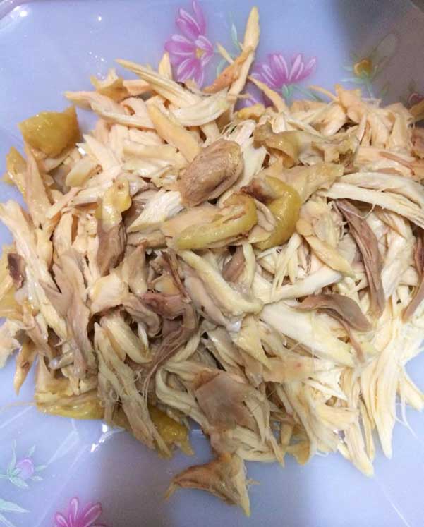 - Gà xé miếng nhỏ. Dùng 1 bát con pha nước trộn. Nước trộn thì dùng 1 chút nước luộc gà, bột canh, mì chính, đường, tiêu, tương ớt, ớt, mỡ gà, nêm nếm vừa miệng sao cho khi trộn với thịt gà có vị đậm đà.