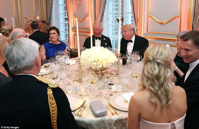 Tổng thống Trump ngồi cạnh Thái tử Charles và Thủ tướng Anh Theresa May tại bữa tiệc.