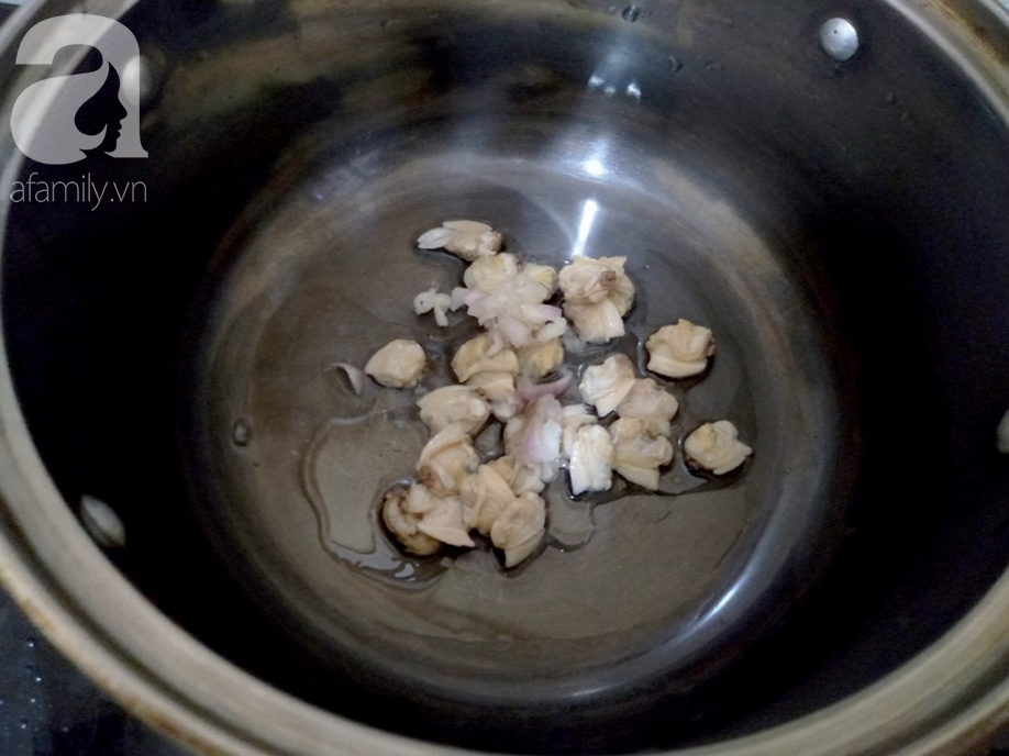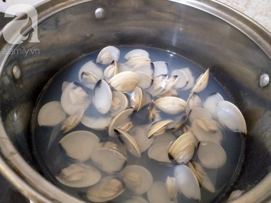 Đổ nước luộc ngao vào, thêm lượng nước lọc vừa ăn vào rồi đun sôi vài phút sau đó tắt bếp.