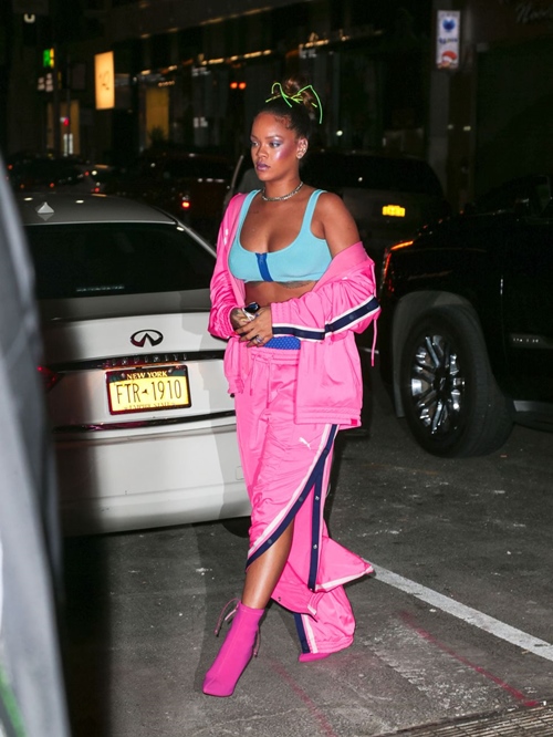 Xanh xanh hồng hồng mà không bị sến, chỉ có thể là Rihanna với bộ đồ quá chóe trên đường phố New York.