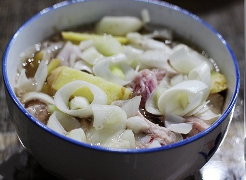 - Bước 2: Cho sườn vào bát, thêm lượng nước đủ ngập mặt sườn, tiếp đó thêm gừng và hành lá vào. Đặt tô sườn vào lò vi sóng bật chế độ lửa cao trong khoảng 10 phút.