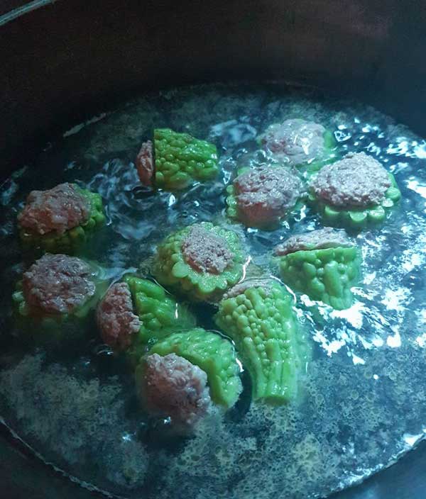 Bắc nồi nước sôi, thả mướp đắng vào, sôi lại hớt bọt, để lửa nhỏ, nêm gia vị vừa ăn.